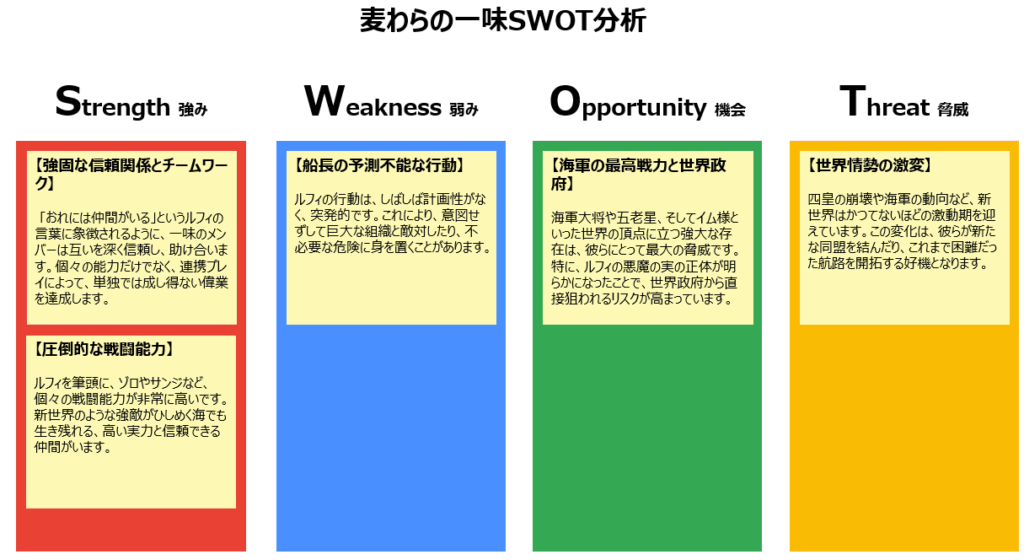 SWOT分析の事例を以下に貼っておきます。題材はOnePiece麦わらの一味についてのSWOT分析です。具体例を見てもらうと、SWOT分析のイメージがつきやすいと思います。